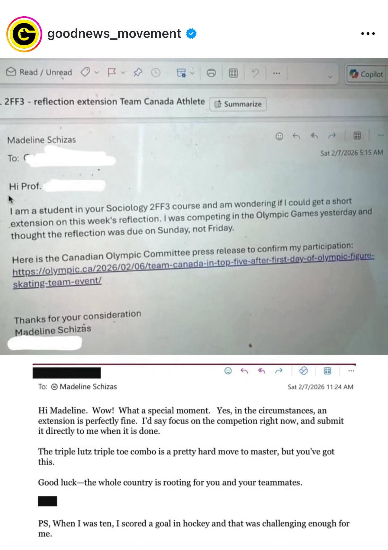 When Olympian Maddie Schizas asked for an extension on an assignment, her professor responded with understanding and support.