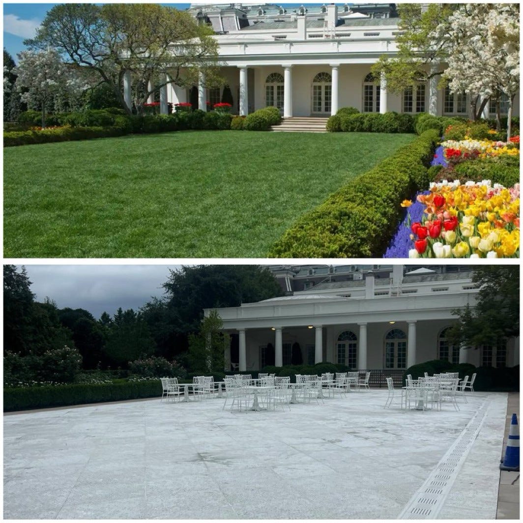 Photos circulating online show the new White House Rose Garden that now resembles a parking lot.
